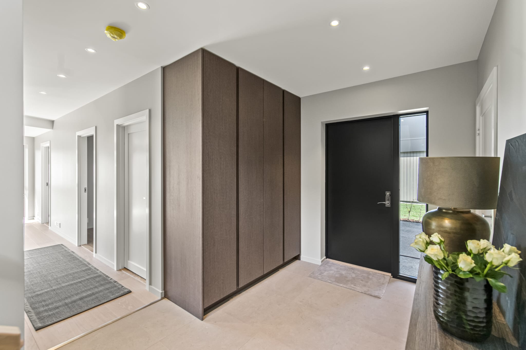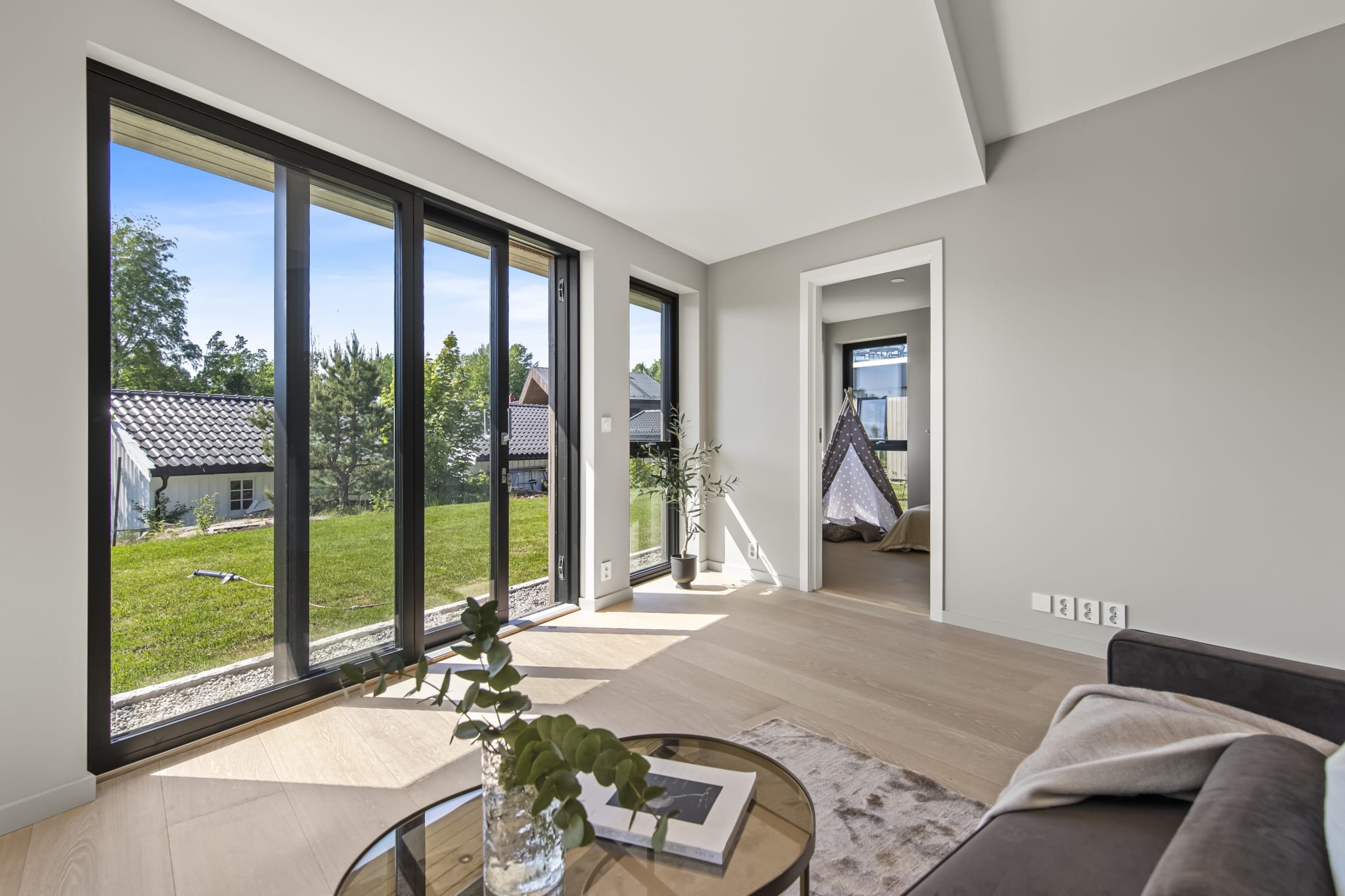 Dobbel garasje, 4 soverom, 2 bad, vaskerom og 2 stuer.