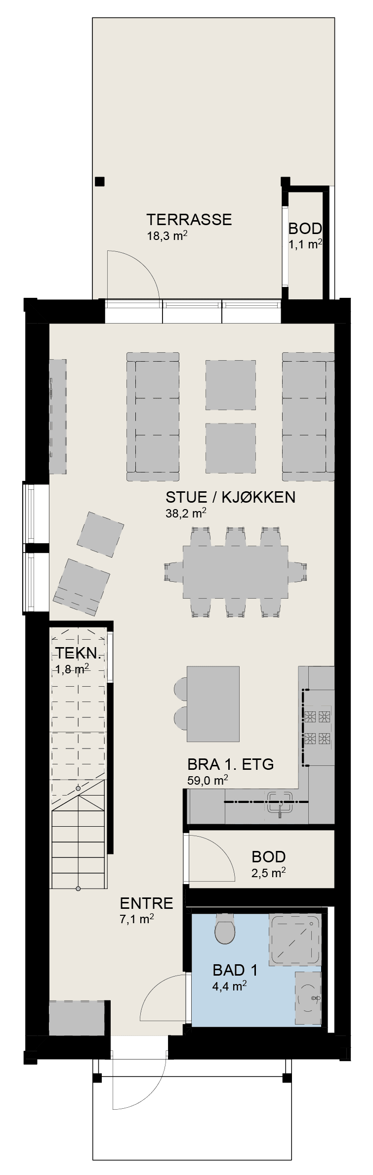1 parkeringsplass i garasjekjeller, terrasse og privat uteplass mot syd.