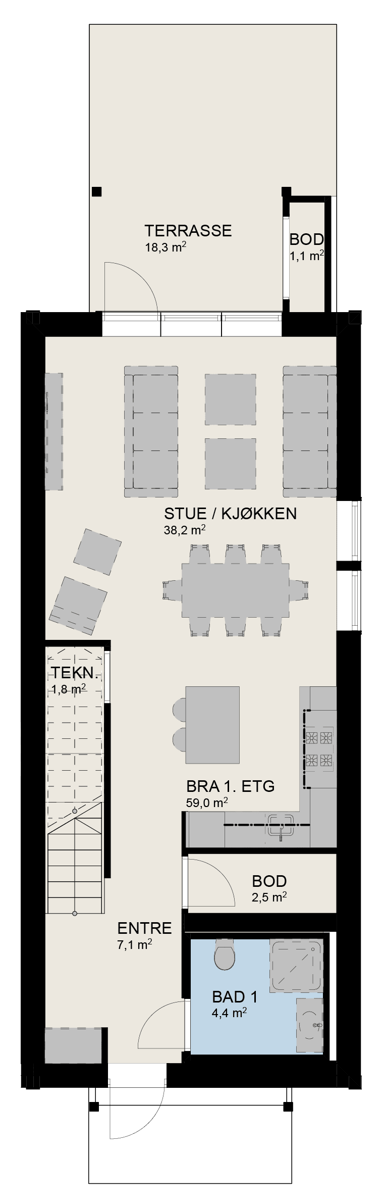 1 parkeringsplass i garasjekjeller, terrasse og privat uteplass mot syd.