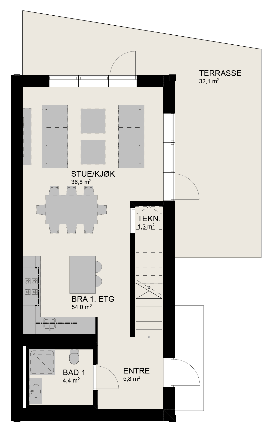 De har romslige terrasser, 3 soverom og 1 garasjeplass i parkeringskjeller.