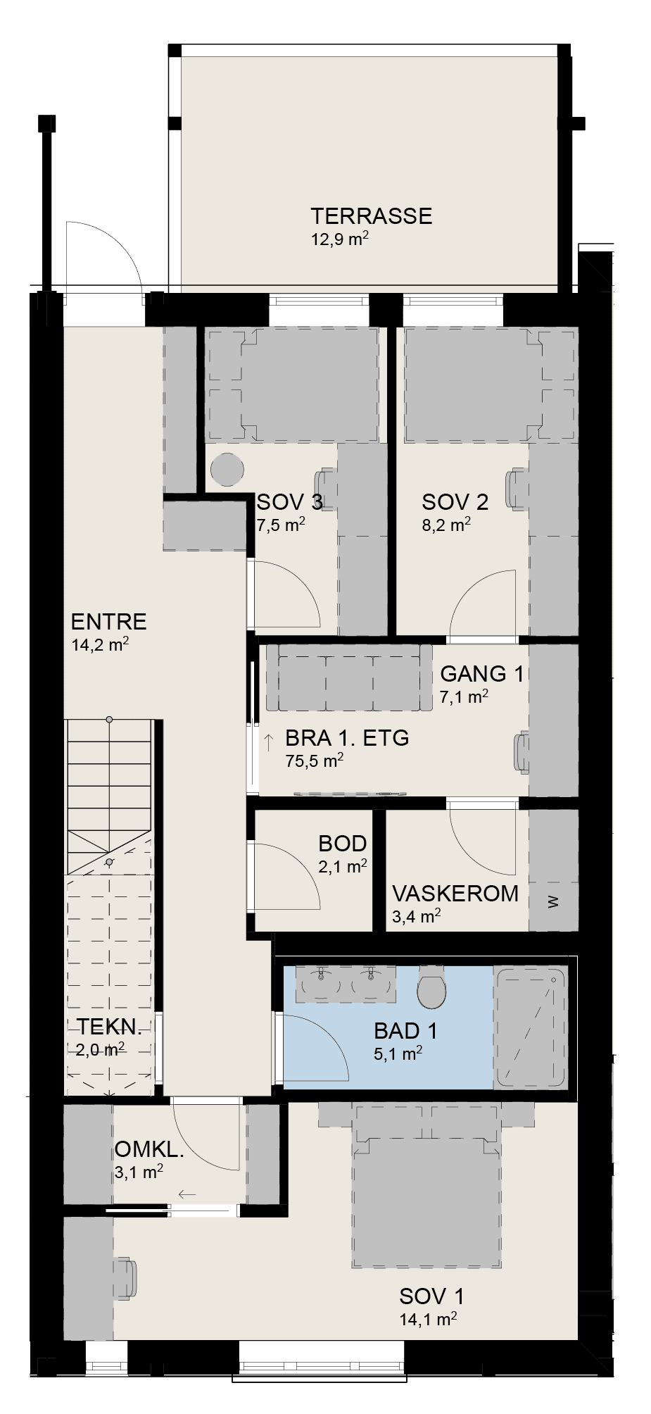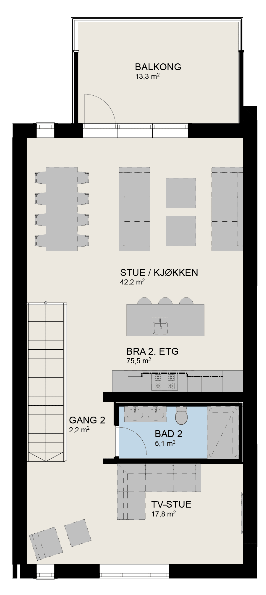 3 soverom, med mulighet for et 4. soverom eller en ekstra TV-stue