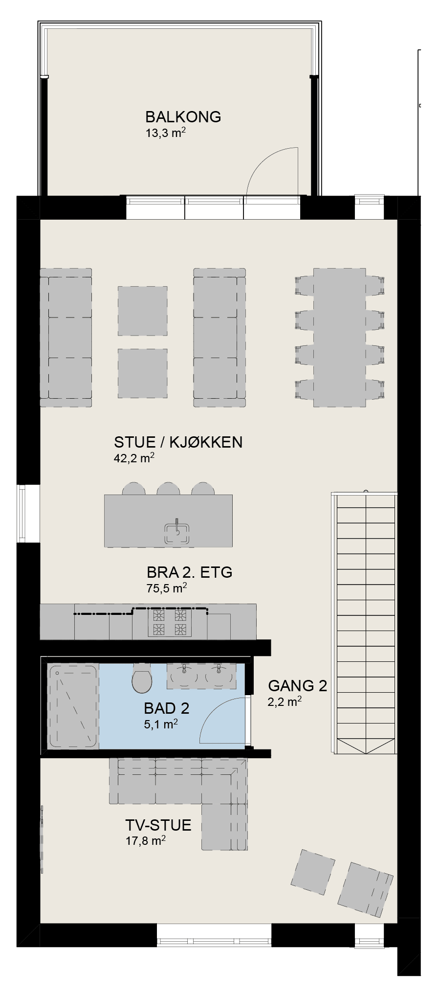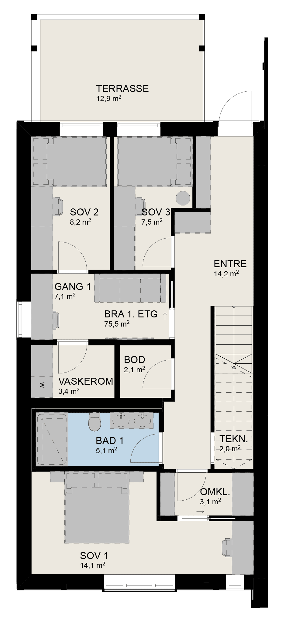 3 soverom, med mulighet for et 4. soverom eller en ekstra TV-stue.