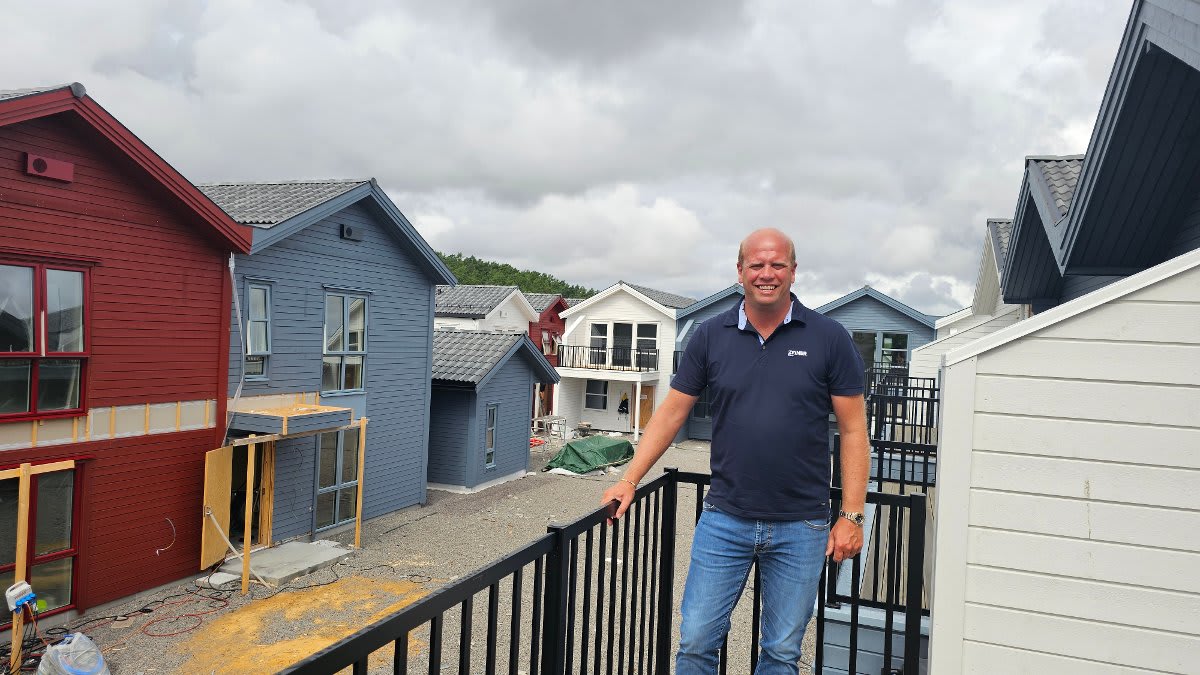 I løpet av de neste fire månedene ferdigstilles alle husene. Zeiner står på grusplassen som snart skal bli uteplasser og parkområde.